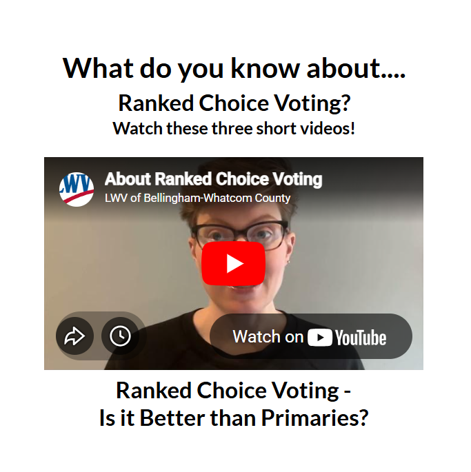 Civics Education page for links to a set of 1- to 2-minute educational videos that Carolyn Stewart, our Communications Specialist, has also been posting on our League’s social media platforms. These videos are charmingly read by Siri Hiltz, using scripts resulting from a collaboration among Civics Education committee members Minda Rae Amiran and Annette Holcomb, communication specialists Robin Barker and Carolyn, as well as Eileen McCracken and Siri.